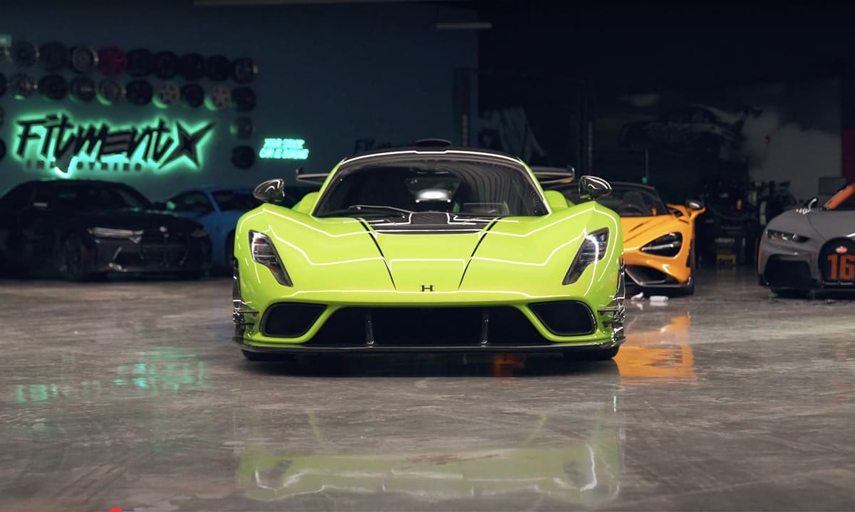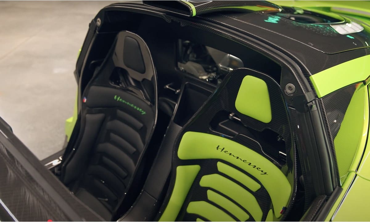 Quand on achète une hypercar aussi exclusive, autant la rendre unique. Steve Hamilton a opté pour une peinture ultra-métallisée vert fluo, pour ne pas passer inaperçu, même dans une collection qui comprend déjà des hypercars Bugatti et Koenigsegg, ainsi que des supercars McLaren et Ferrari, entre autres. Sur l’aileron arrière, se trouve un drapeau américain « fantôme » subtilement peint — un clin d’œil à l’origine de cette bête de course fabriquée aux États-Unis. Un autre détail marquant : les sièges dépareillés, l’un vert, l’autre noir, apportant une touche unique à cet exemplaire.