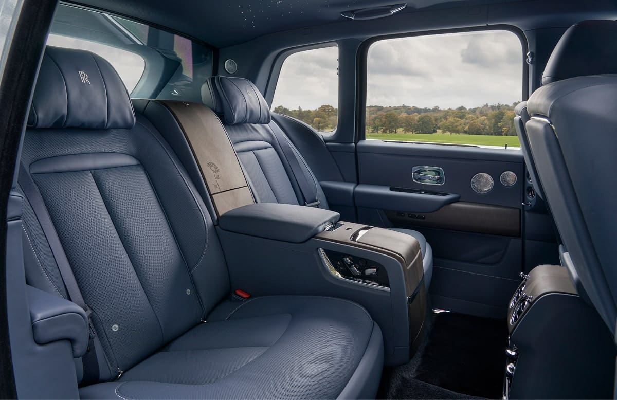 À l’intérieur, chaque détail raconte une histoire. Le mobilier est habillé de cuir Fleet Blue, qui contraste magnifiquement avec des accents de cuir Selby Grey et noir. Le résultat est un équilibre parfait entre élégance et sophistication, tout en restant ancré dans l’esprit de la nature et de l’aventure. Les sièges sont ornés de coutures contrastées et de monogrammes sur les appuie-têtes, un clin d’œil subtil à l’héritage Rolls-Royce.