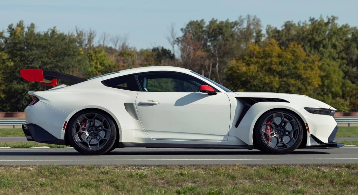 Ce qui frappe en premier, c’est la livrée de cette Mustang GTD. Arborant une carrosserie Performance White agrémentée de bandes rouges et bleues, elle rend hommage à l’iconique logo tribar de la Mustang et aux couleurs portées par Craig Breedlove, légende des records de vitesse des années 1960. Chaque détail de la GTD Spirit of America reflète cet héritage, jusqu’au lettrage rouge “Mustang” sous l’aileron arrière. Ford utilise massivement la fibre de carbone apparente pour améliorer l’aérodynamisme, notamment sur le splitter avant, le diffuseur et le grand aileron arrière. En plus d’améliorer les performances, cette utilisation de la fibre de carbone réduit le poids global du véhicule. Le mélange d’élégance et de performance donne à cette Mustang une allure à la fois agressive et sophistiquée, capable de faire tourner les têtes, que ce soit sur circuit ou en ville.