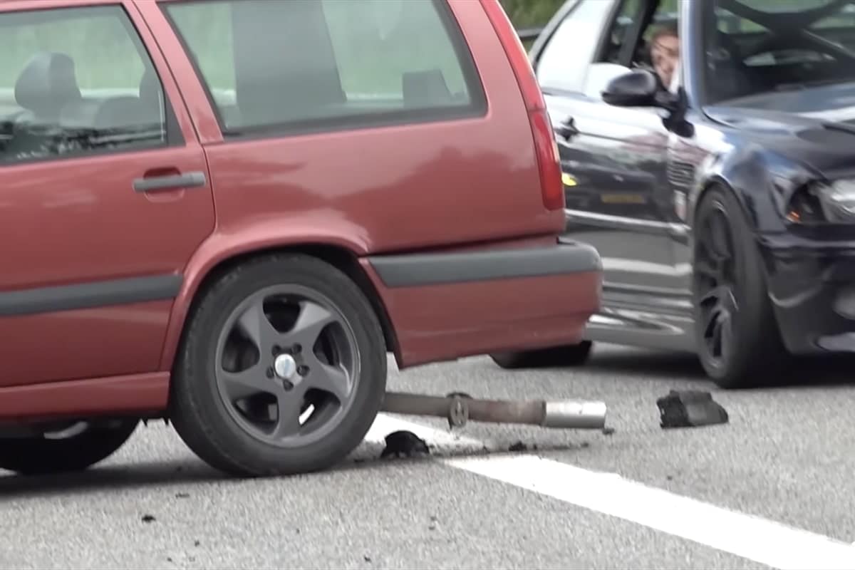 La Volvo attendait simplement d’entrer dans une station-service, mais elle était garée de manière un peu trop en travers. Le conducteur de la Ferrari, ne laissant pas assez d’espace pour passer, a heurté l’arrière de la Volvo. Résultat : un léger impact, mais de gros dégâts pour la voiture suédoise. L’échappement s’est délogé, et la Volvo a dû se retrouver avec des dégâts visibles à l’arrière.