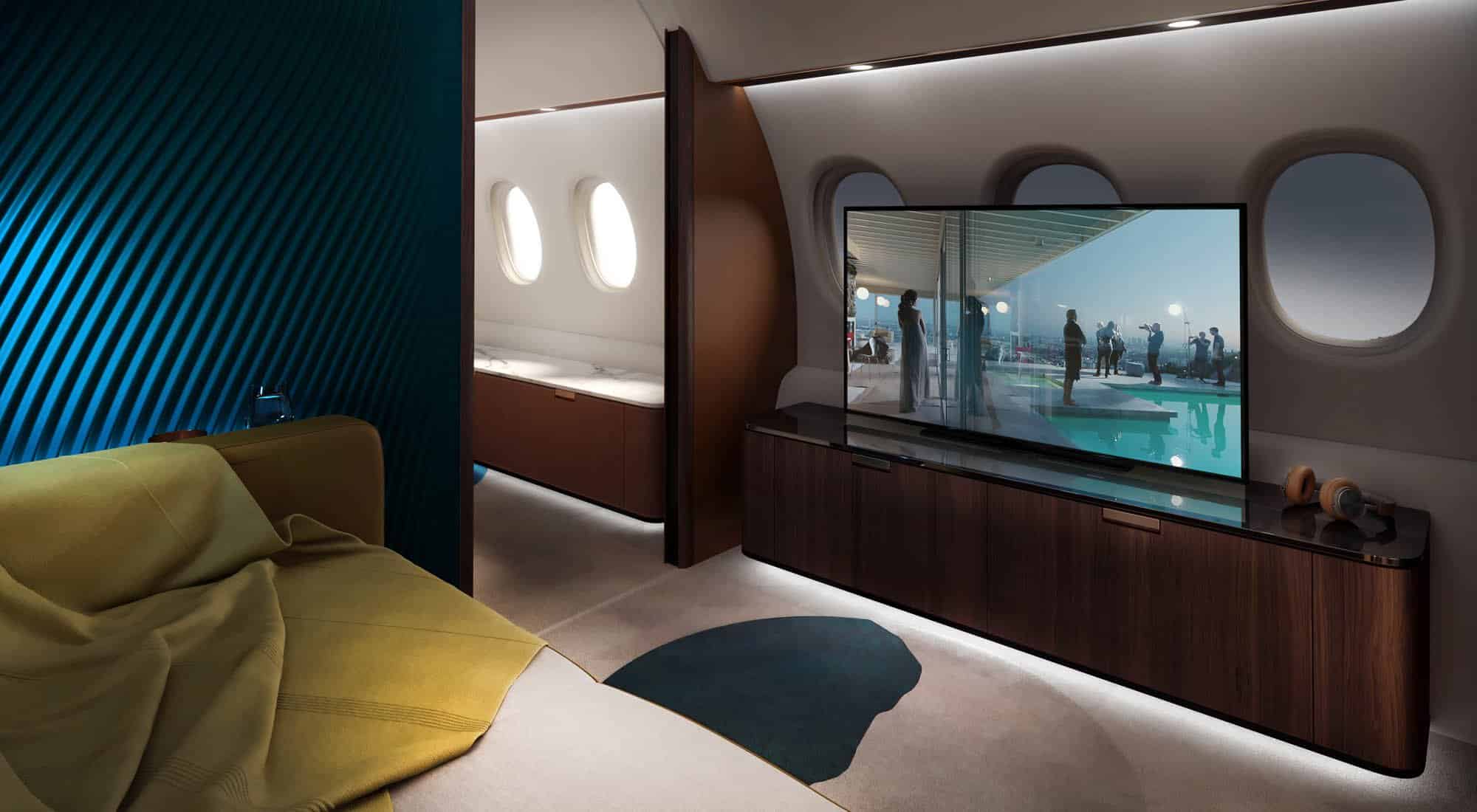 Dès qu’on met un pied à bord, l’expérience change complètement. Oubliez les agencements classiques des jets privés : ici, on parle d’un véritable appartement de luxe dans le ciel. Avec une hauteur de cabine de 2,03 mètres et une largeur de 2,77 mètres, c’est la plus spacieuse de sa catégorie. Mais l’espace ne fait pas tout : l’aménagement est entièrement personnalisable. Salon privé, salle de réunion ou à manger, espace cinéma avec écran géant, chambre avec lit double, et le plus fou : une salle de bain avec une douche pour deux personnes avec plus de 30 minutes d’eau chaude… Tout est modulable. Même la cuisine a été conçue pour des repas gastronomiques, garantissant une expérience digne des plus grands restaurants, à 40 000 pieds d’altitude.