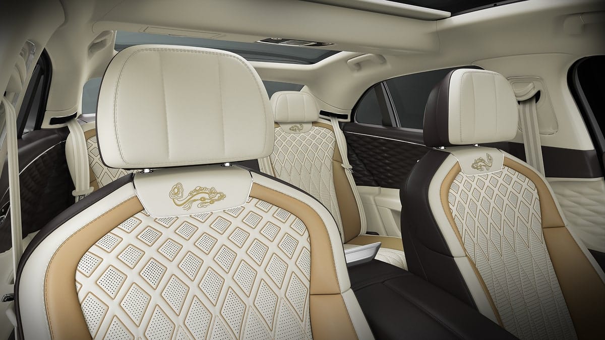 Bentley s’est appuyé sur des symboles forts de la culture chinoise pour donner vie à cette collection unique. Parmi eux, le Koi, poisson emblématique représentant chance et courage, est brodé à l’intérieur de la Bentayga EWB (la version allongée de son SUV). L’habitacle noir profond est rehaussé d’accents orange mandarine, et six poissons brodés nagent dans le sens des aiguilles d’une montre, direction associée à la prospérité en Chine. L’extérieur, quant à lui, affiche des touches dorées — symbole de richesse et de bonheur.