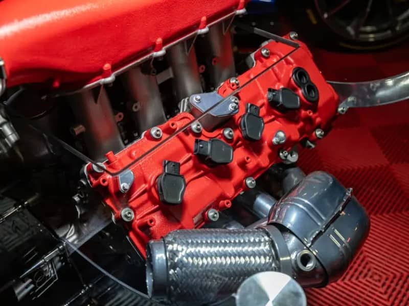 Comme vous pouvez l’imaginer, cette table basse proposée par RM Sotheby’s n’est pas une simple décoration pour un garage de luxe. Elle est construite autour d’un véritable moteur atmosphérique 4,5 litres F136, le même qui équipait la légendaire Ferrari 458 Italia. Utilisé sur les modèles de route et en compétition, ce moteur a été soigneusement nettoyé et préparé pour devenir une œuvre d’art fonctionnelle. Les bobines d’allumage d’origine et de nombreux détails mécaniques restent visibles sous un plateau en verre trempé de 1,3 cm d’épaisseur. Le détail qui fait la différence : la découpe du verre met en valeur les imposants collecteurs d’admission rouges, une signature des moteurs Ferrari.